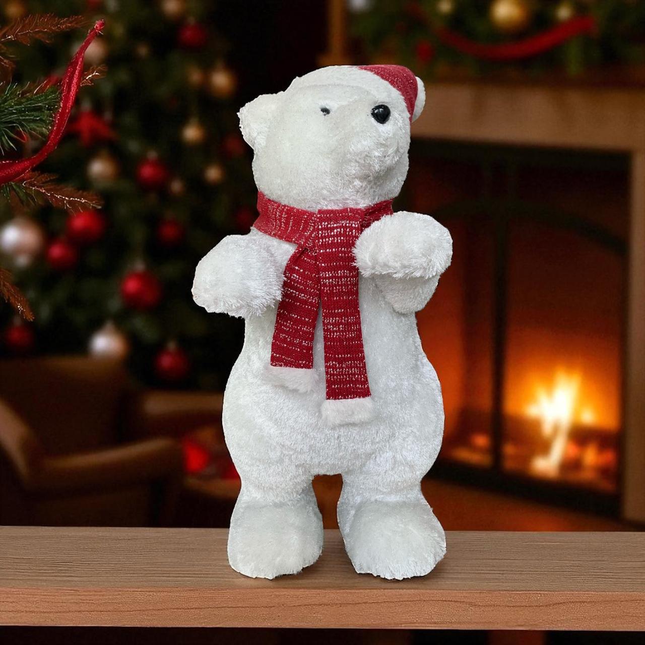 Decora tu hogar con ternura y espíritu navideño. Este adorable oso polar de peluche, con su gorro y bufanda rojos, es el complemento perfecto para tu decoración en estas fiestas.