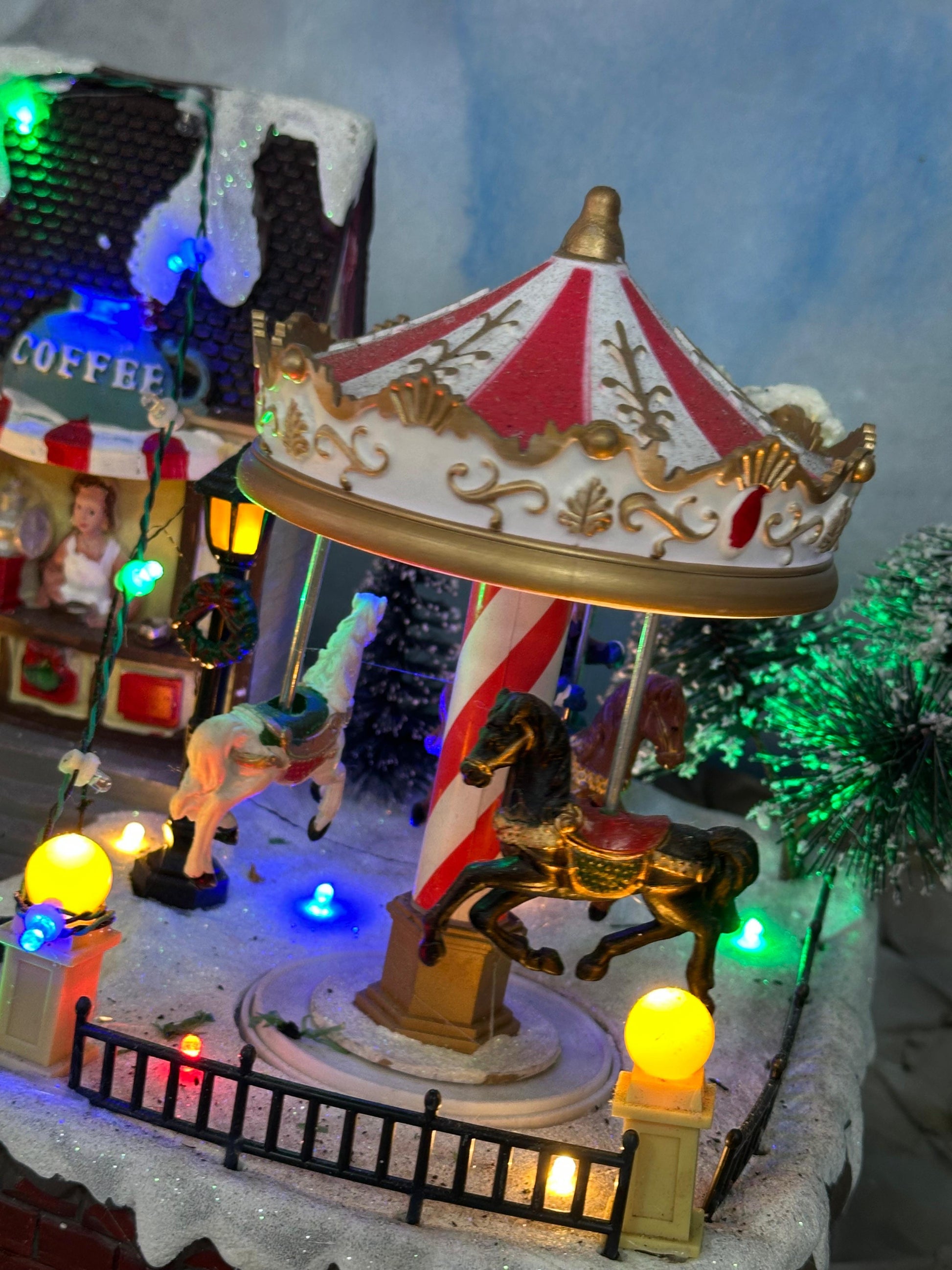 • 🎡 Carrusel iluminado que simula movimiento con sus caballitos.