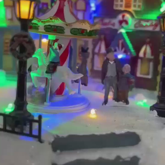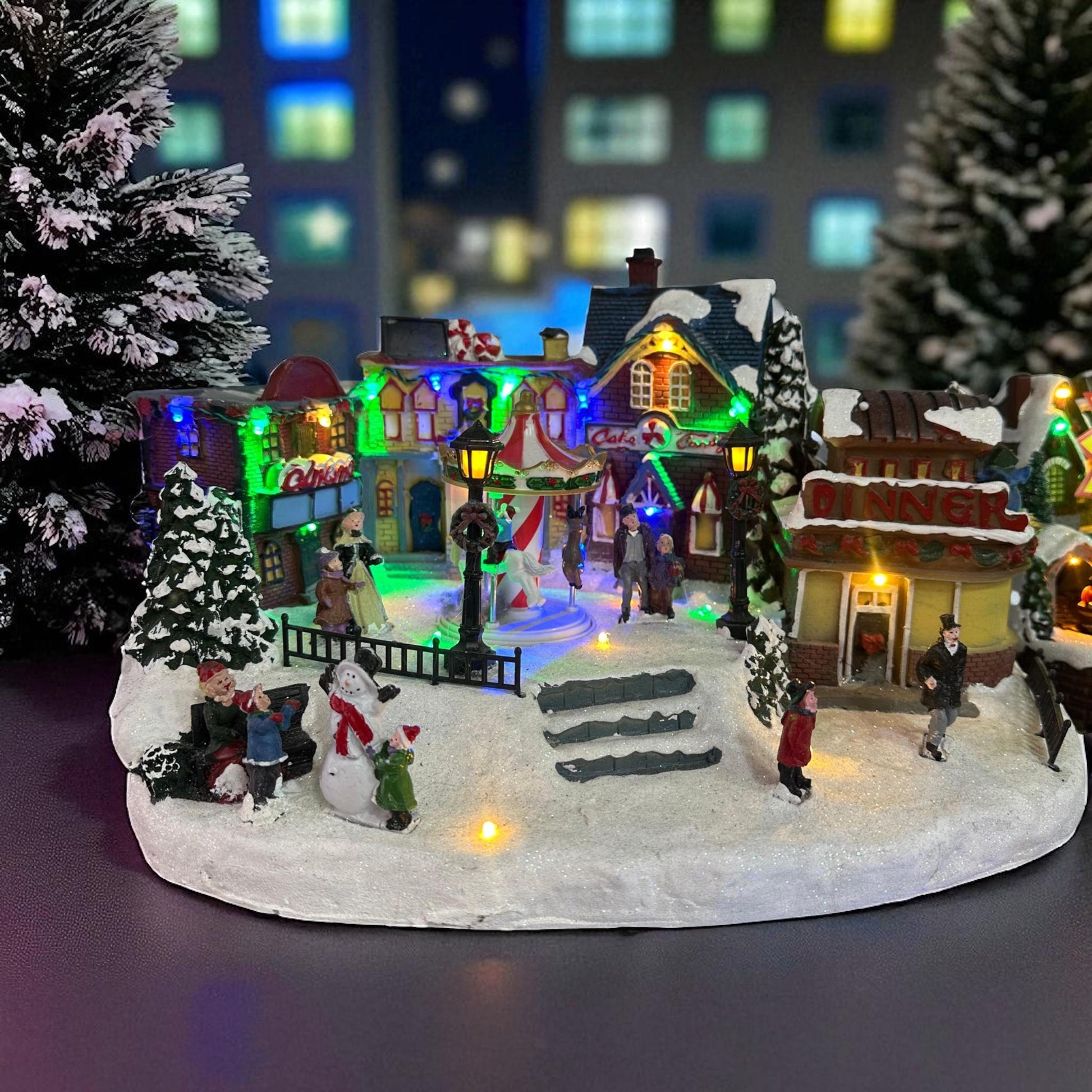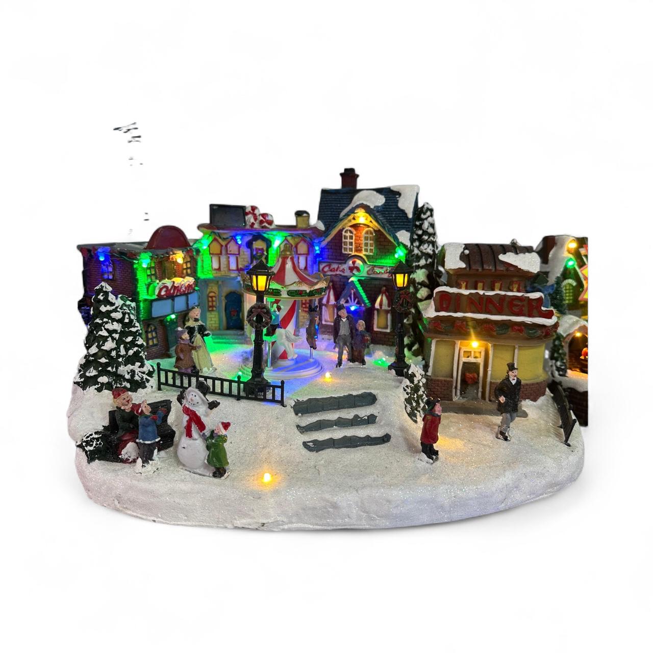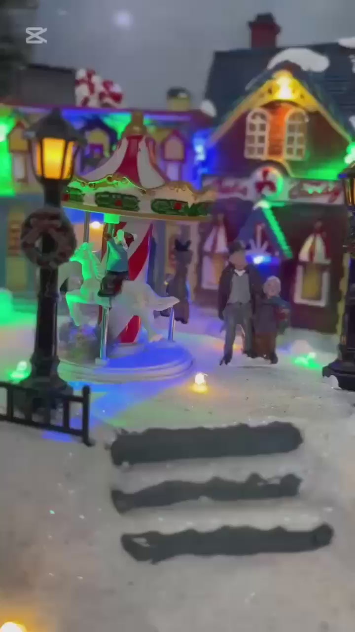 • 🏘️ Escena detallada con casas, figuras, faroles y muñeco de nieve.